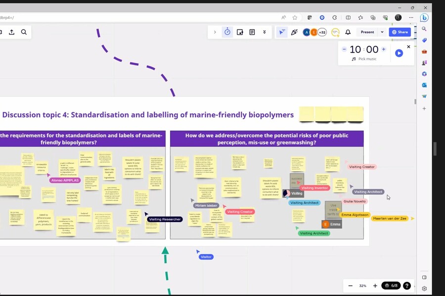 Participants offered many insightful inputs in an open discussion using MIRO board interactive tool and structured around the following topics: Definition of marine friendly biopolymer, programmed biodegradation, ecotoxicity and overall risk assessment, standardisation and labelling of marine-friendly biopolymers and EU projects recommendations for future policies on marine-friendly biopolymers. The objective was to define the characteristics that marine-friendly biopolymers should have to become a potential solution to prevent and eliminate pollution in the oceans and waters, responding to EU Mission Ocean's objectives. This is just the kick-off of a wider and urgently needed debate. We hope this workshop could stimulate EU-funded projects, researchers, stakeholders and policy makers to further explore this topic.